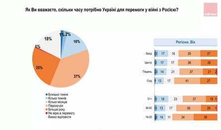 За результатами свіжого опитування, 25% українців вважають, що для перемоги потрібно понад рік, 37% — пів року-рік. У той же час майже 20% оцінюють необхідний для перемоги час до декількох місяців.