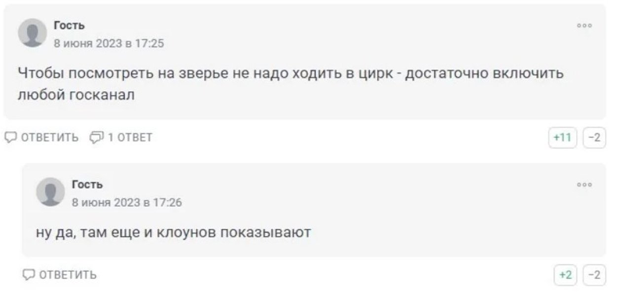 "У цій країні чоловіків цінують навіть менше, ніж худобу. Народитися чоловіком у Росії – це велика біда", "Бенкет серед чуми", "Щоб подивитися на звірів не треба ходити до цирку – достатньо включити будь-який держканал", "Їм лише сміятися", – висловилися фолловери.