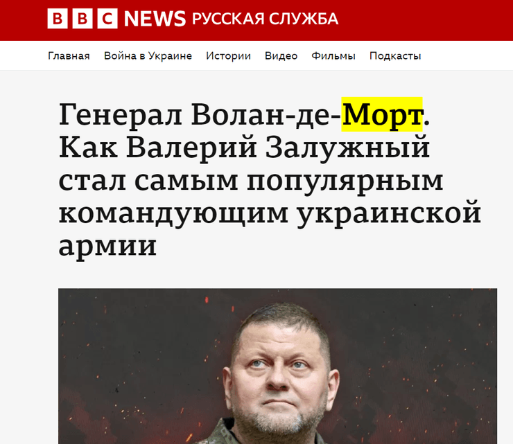 Статті британського мовника ВВС про головнокомандувача ЗСУ вийшли з різними заголовками в залежності від локації редакцій. Російська служба порівняла його з головним злодієм із серії книг про Гаррі Поттера.