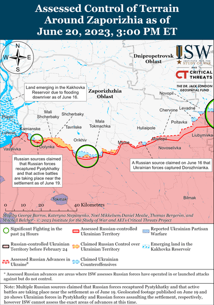 На кордоні між Запорізькою та Донецькою областями зараз розгоряються жорстокі бої, які призводять до можливої зміни контролю над населеними пунктами обома сторонами. Незважаючи на це, українські збройні сили продовжують просуватись як у цьому регіоні, так і в інших напрямках. Про це йдеться у звіті американського Інституту вивчення війни (ISW), опублікованому 20 червня.