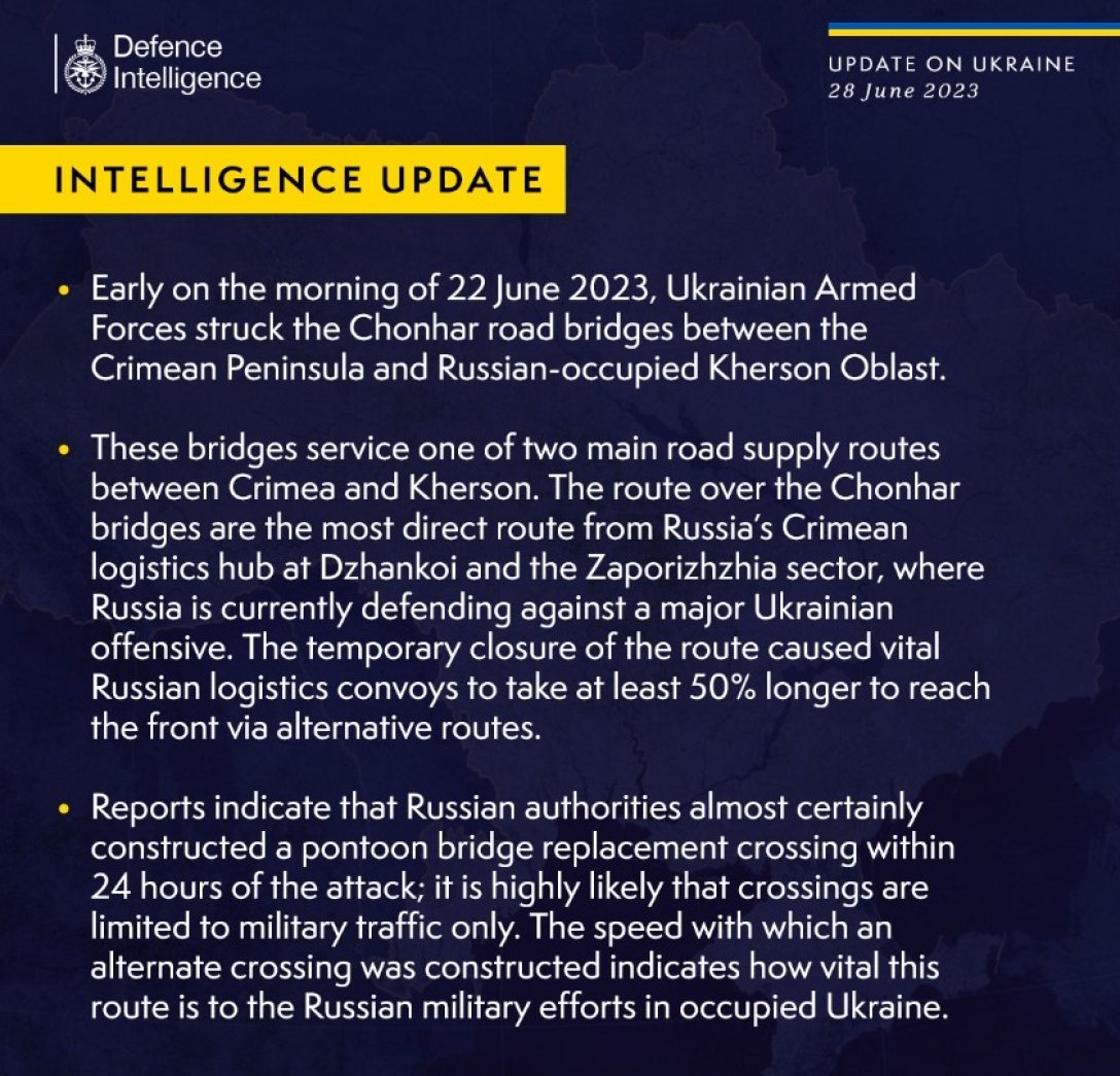 Українські збройні сили 22 червня завдали удару по Чонгарських автомобільних мостах між Кримським півостровом і окупованою Росією Херсонською областю. В результаті військовий транспорт добирався до фронту альтернативними маршрутами щонайменше на 50% довше, що стало серйозною проблемою для логістики окупантів. Про це 28 червня повідомила пресслужба Міноборони Великої Британії.