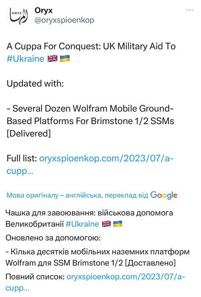 В Україну доставлені кілька десятків мобільних наземних платформ Wolfram для ракет SSM Brimstone 1/2. Відповідним оновленням щодо військової допомоги Великої Британії поділилися в соцмережах аналітики Oryx.