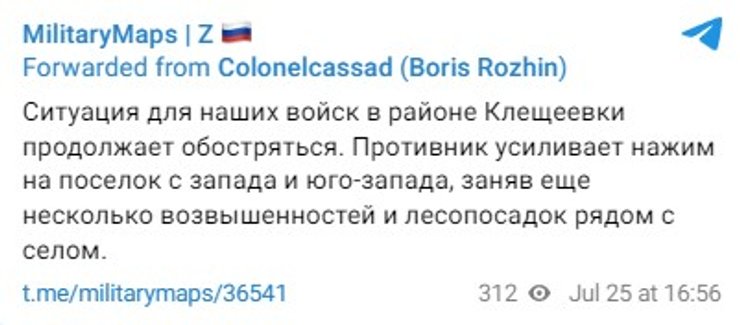 За непідтвердженими даними, російські війська в Кліщіївці опинилися під загрозою удару Сил оборони з флангів, але про повний контроль над селищем поки що не йдеться.