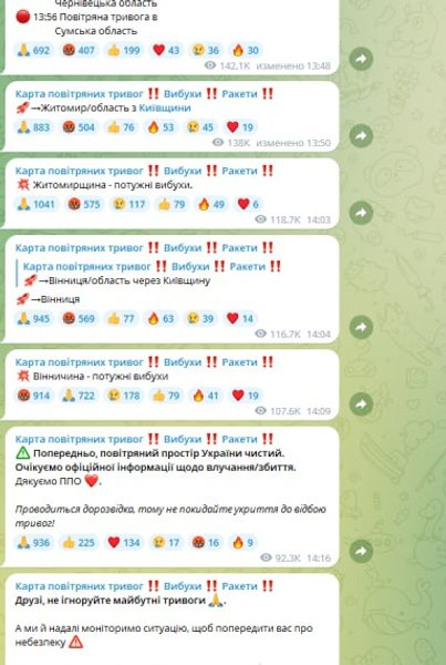 За кілька хвилин після оголошення тривоги в мережі повідомили про вибухи на Житомирщині та на Вінниччині, зокрема, проінформували про роботу ППО у Вінницькій області.