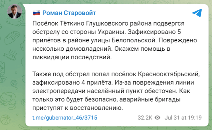Крім того, як повідомив губернатор Курської області Роман Старовойт, 31 липня селище Тьоткіно Глушковського району нібито зазнало обстрілу.