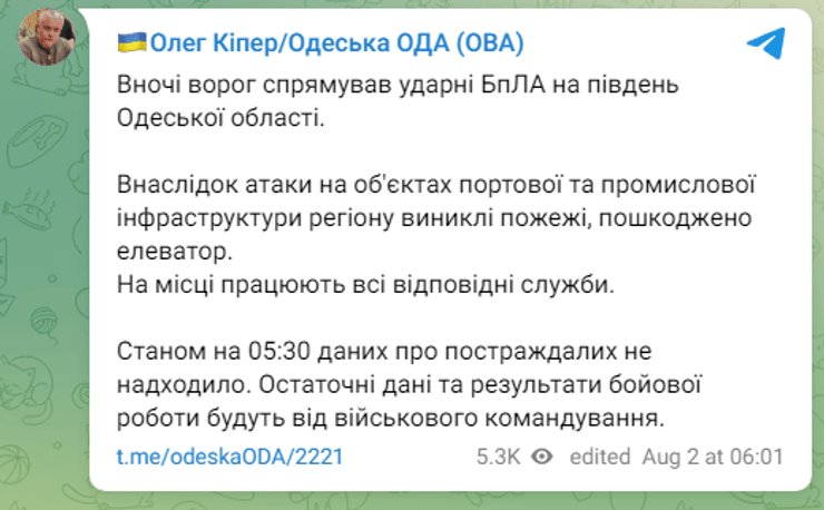"Унаслідок атаки на об'єктах портової та промислової інфраструктури регіону виникли пожежі, пошкоджено елеватор. На місці працюють усі відповідні служби", — повідомив Кіпер.