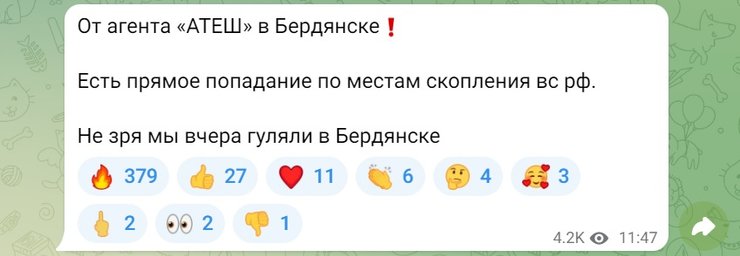 "Від агента "АТЕШ" у Бердянську. Є пряме попадання по місцях скупчення зс рф. Не дарма ми вчора гуляли в Бердянську", — повідомляють в Telegram-каналі учасників руху.
