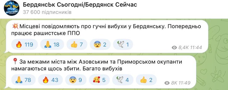 "Місцеві повідомляють про гучні вибухи в Бердянську. Попередньо працює рашистська ППО. За межами міста між Азовським і Приморськом окупанти намагаються щось збити. Багато вибухів", — пишуть у Telegram-каналі Бердянськ Зараз.
