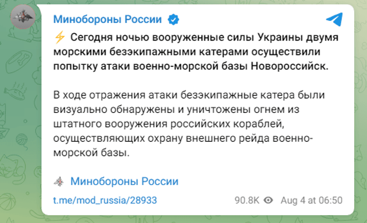 Уранці 4 серпня в Міністерстві оборони Російської Федерації заявили, що "успішно" відбили атаку двох надводних дронів ЗСУ. У відомстві стверджували, що обидва дрони були знищені вогнем зі штатного озброєння російських кораблів.