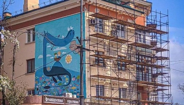 Аналогічна доля чекала і на мурал із казковим персонажем — динозавром Нессі, який перевозить на собі двох дітей.