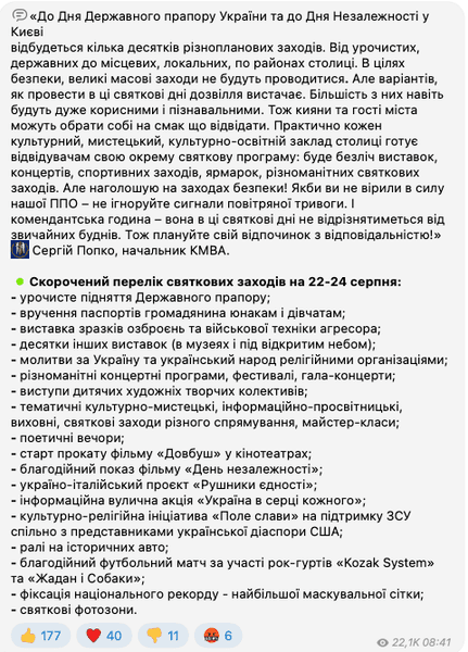 При цьому варто зазначити, що ще 16 серпня у Київській міській військовій адміністрації анонсовували цілу низку заходів з нагоди Дня Державного прапора та Дня Незалежності.