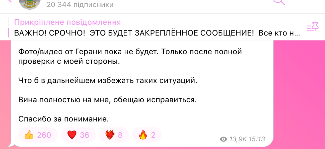 Адміністратор каналу, який опублікував неправдиву інформацію, визнав, що кадри — це фейк. Водночас він запевняє підписників, що Синьківка перебуває у "сірій зоні".