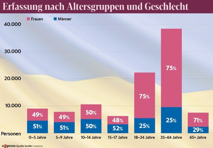 Австрійська влада зареєструвала 33 387 українських дітей-біженців. Співвідношення хлопчиків і дівчаток майже однакове. У матеріалі йдеться про те, що з 18 років стає зрозуміло: 75% біженців — жінки, лише 25% — чоловіки (вік: від 18 до 54 років). Проте дані МВС підтверджують, що великій кількості українських чоловіків призовного віку вдалося втекти від участі й у бойових діях.