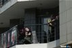 "Нагорі, на зовнішніх сходах, працівники офісу вивішують чорний прапор з черепом, ще один такий самий кріпить біля паркану міцний чоловік у камуфляжі, чорних окулярах і балаклаві. Він довго стоїть біля фотографій, потім падає на коліна, притулившись чолом до бетонного парапету. І плаче", — описали у медіа.