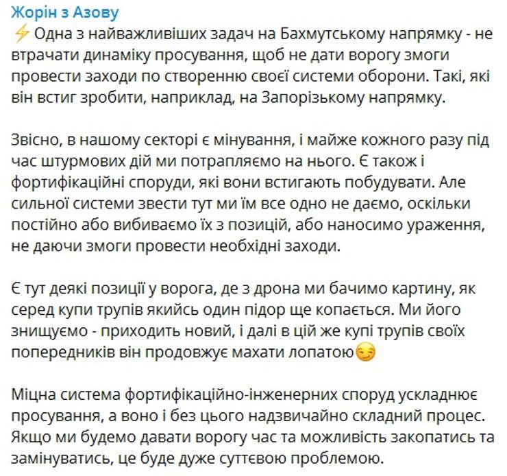 Головне завдання Сил оборони — не втрачати динаміку просування, аби російські загарбники не змогли провести заходи щодо створення своєї системи оборони в районі Бахмута. Про це повідомив у Telegram майор ЗСУ Максим Жорін, заступник командира 3-ої штурмової бригади.