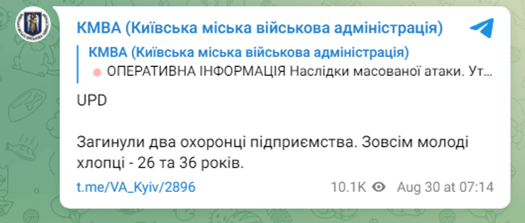 За інформацією Київської міської військової адміністрації, загинули двоє охоронців підприємства — чоловіки 26-и й 36-и років.