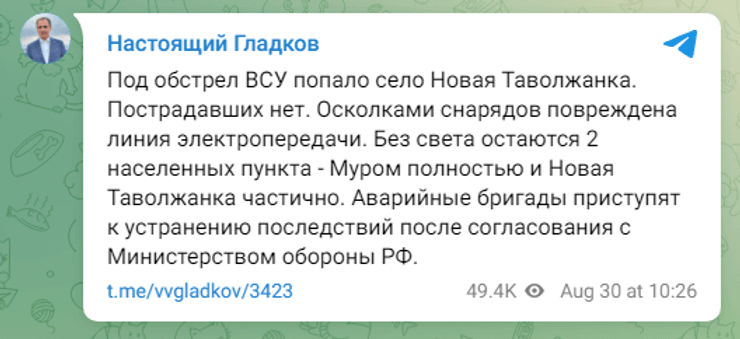 "Без світла залишаються 2 населених пункти — Муром повністю й Нова Таволжанка частково. Аварійні бригади розпочнуть усунення наслідків після узгодження з Міністерством оборони РФ", — повідомив Гладков.