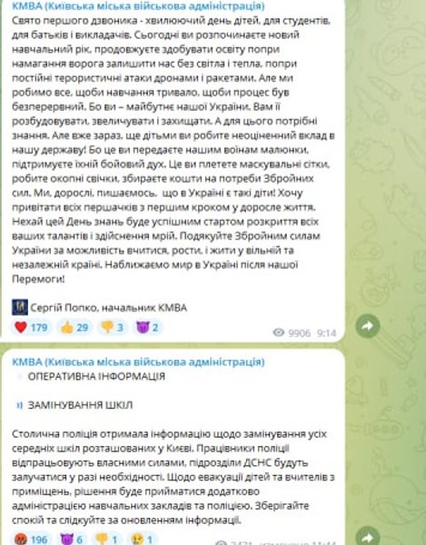 "Столична поліція отримала інформацію щодо замінування усіх середніх шкіл розташованих у Києві. Працівники поліції відпрацьовують власними силами, підрозділи ДСНС будуть залучатися у разі необхідності. Щодо евакуації дітей та вчителів з приміщень, рішення буде прийматися додатково адміністрацією навчальних закладів та поліцією", — закликають киян в КМВА.