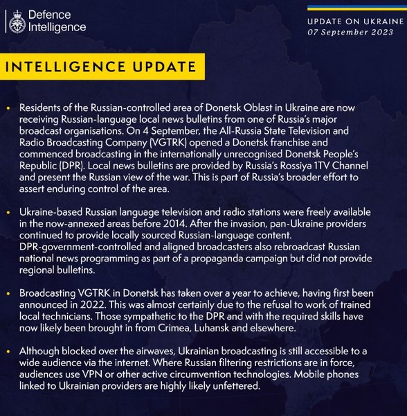 Росія намагається встановити міцний контроль на території Донецької області в інформаційному аспекті. З 4 вересня в "ДНР" розпочала ефірне мовлення філія Всеросійської державної телевізійної і радіомовної компанії (ВДТРК) і тепер жителі окупованої області отримують новини російською мовою від однієї з найбільших російських телерадіомовних організацій. Про це 7 вересня повідомила пресслужба Міноборони Великої Британії.