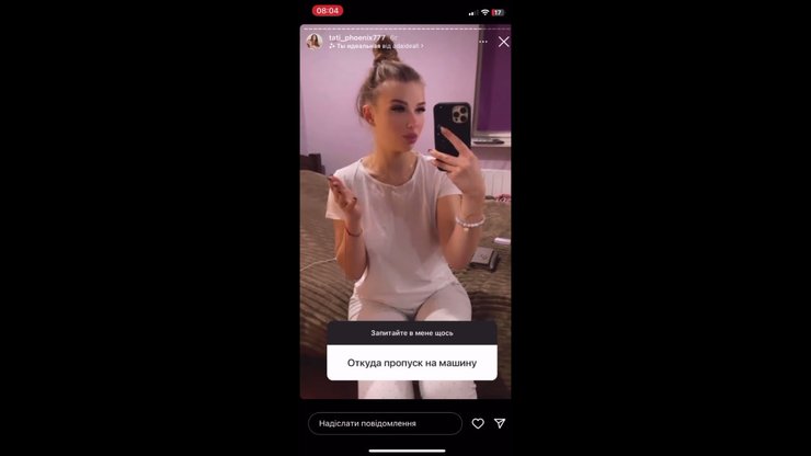 "Купа питань з приводу пропуску. Цей пропуск у мене. Блін, я не знаю. У липні був рік як він у мене. Звідки він у мене? Я не буду розповідати. Це особиста інформація — хто мені зробив цей пропуск, так? Ну, звичайно, я не буду про таке розповідати", – сказала дівчина.