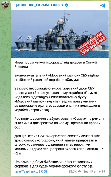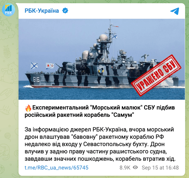 Російський провоєнний телеграм-канал також повідомив про інцидент у Севастополі. У публікації йдеться, що екіпаж ракетного корабля "Самум" "успішно відбив атаку" українського дрона.