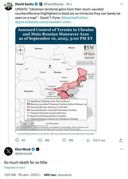 В підтвердження своїх слів він додав карту американського Інституту вивчення війни з окупованими територіями станом на 16 вересня. Також економіст послався на матеріал видання dpyne.substack під назвою "Західні ЗМІ нарешті визнали, що Україна програла війну".