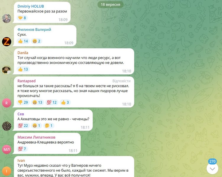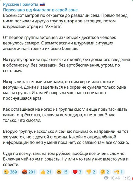 Росіяни намагались зачепитись на околиці села. При цьому по них ЗСУ били касетами, мінами, танками і "працювали вертушки". Коли ж прорвались на околицю, "прокинулась" артилерія ЗС РФ: "по нашим в*ала", — поскаржився окупант.