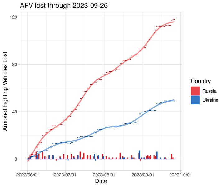 Втрати військової техніки у російських окупантів значно перевищують втрати на полі бою Сил оборони. Про це йдеться в інфографіці, опублікованій аналітиком під псевдонімом leedrake5 26 вересня.