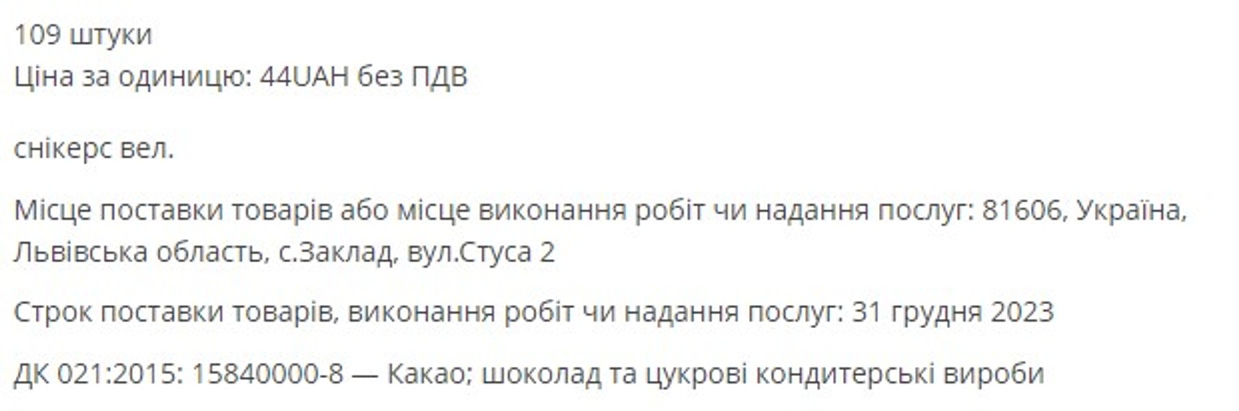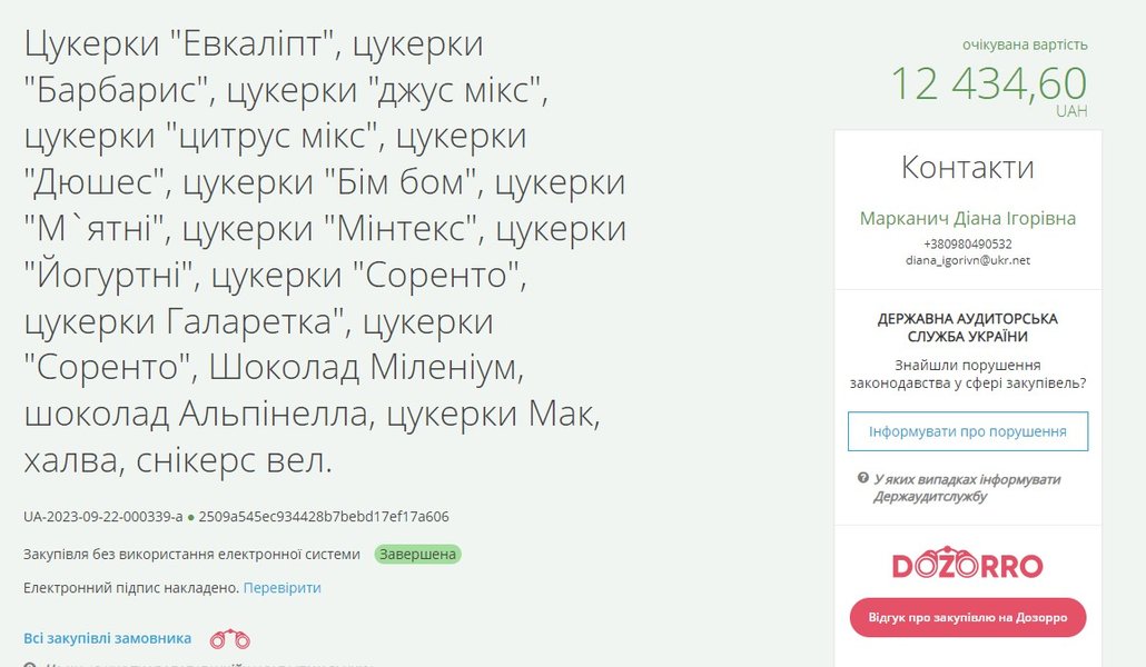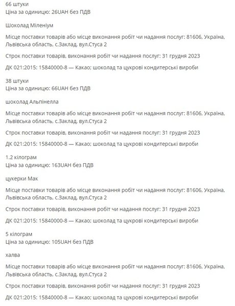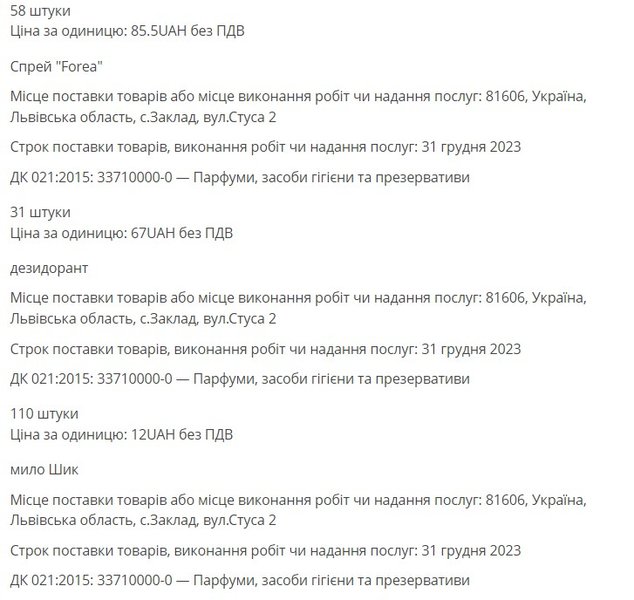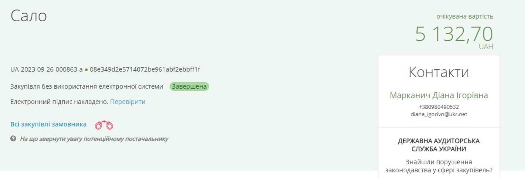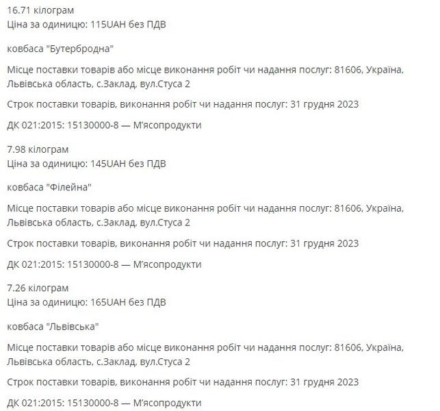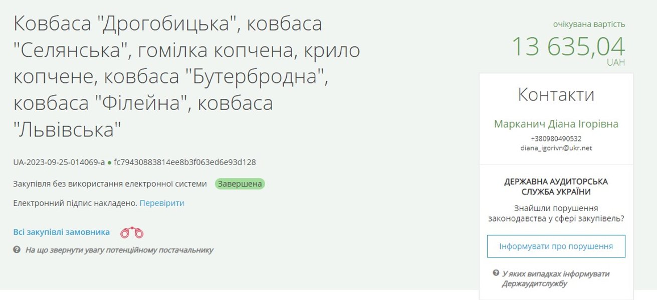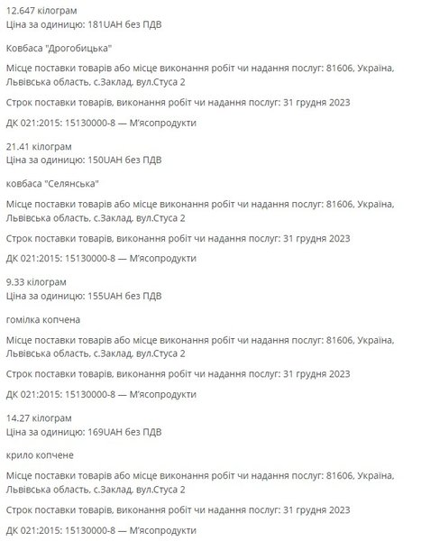 М'ясопродукти: планують витратити 13635 грн на вісім видів ковбаси. Найдорожча позиція — ковбаса "Дрогобицька" за 181 грн/од. (вага не вказана). У мережі аналогічний коштує 143 грн/од.