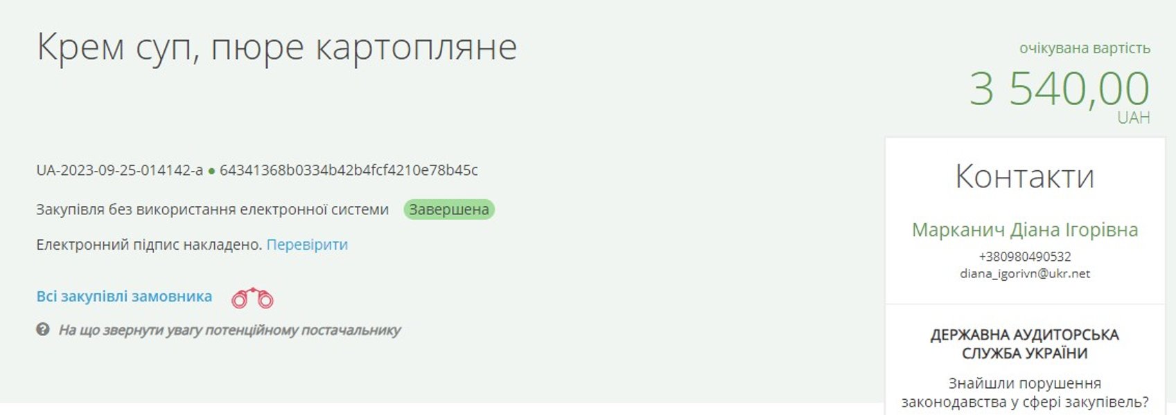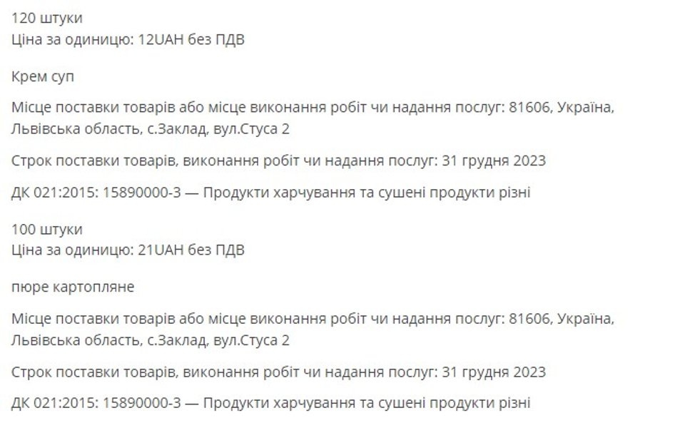 Крем-супи, пюре картопляне: планують витратити 3540 грн на крем-суп (120 шт. по 12 грн/шт, вага не вказана) та картопляне пюре (100 шт. по 21 грн/шт., вага не вказана). У мережі, наприклад, пюре можна знайти за 16 грн за упаковку вагою 40 гр.
