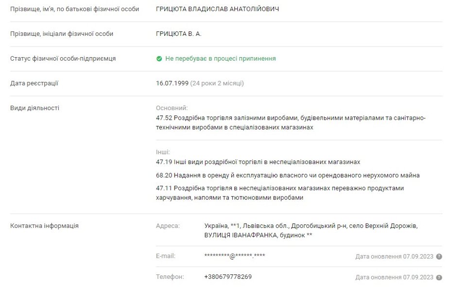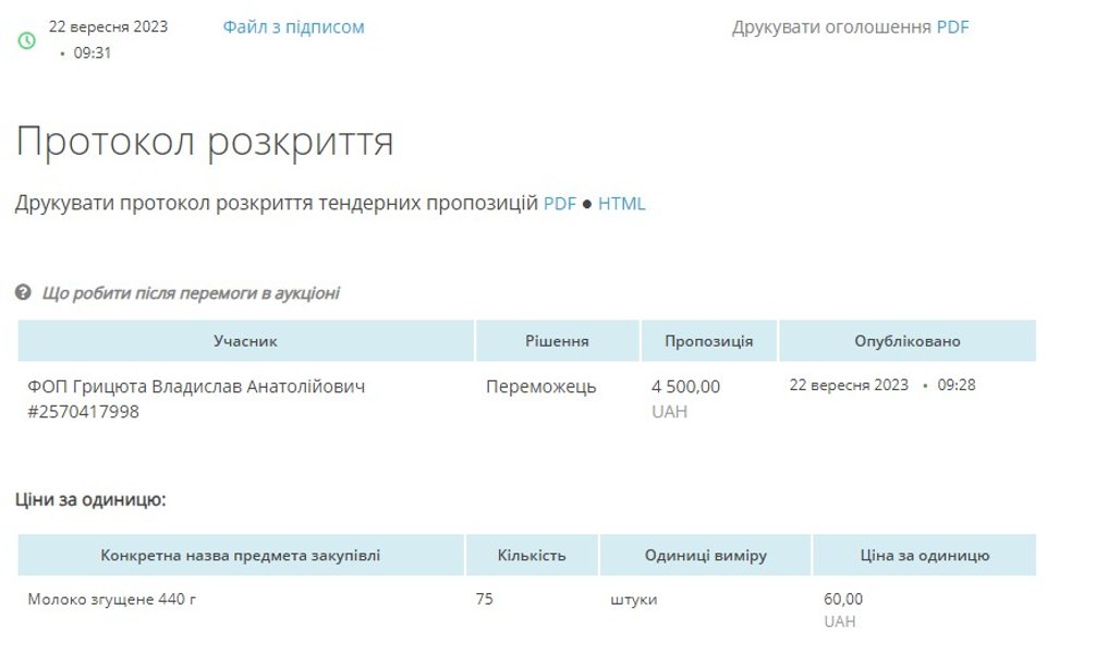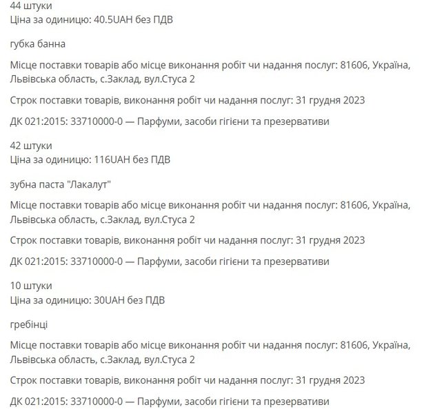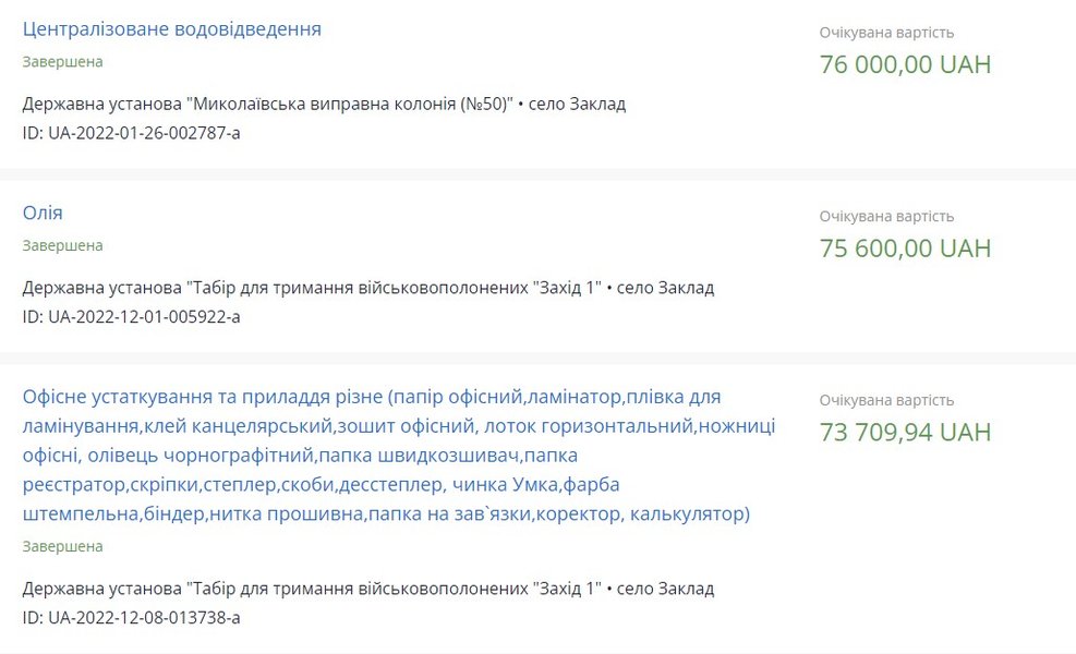 Усі розглянуті тендери відбулись в період з 22 по 26 вересня 2023 року. В усіх переможцем і постачальником для колонії став єдиний підприємець — ФОП Грицюта Владислав Анатолійович. Підприємець заснував ФОП у 1999 році, зареєстрований у Дрогобицькому районі.