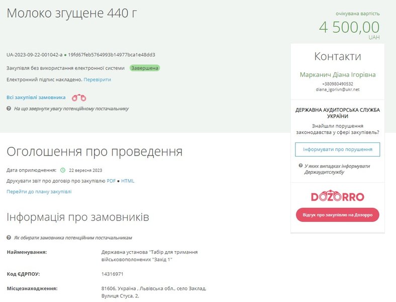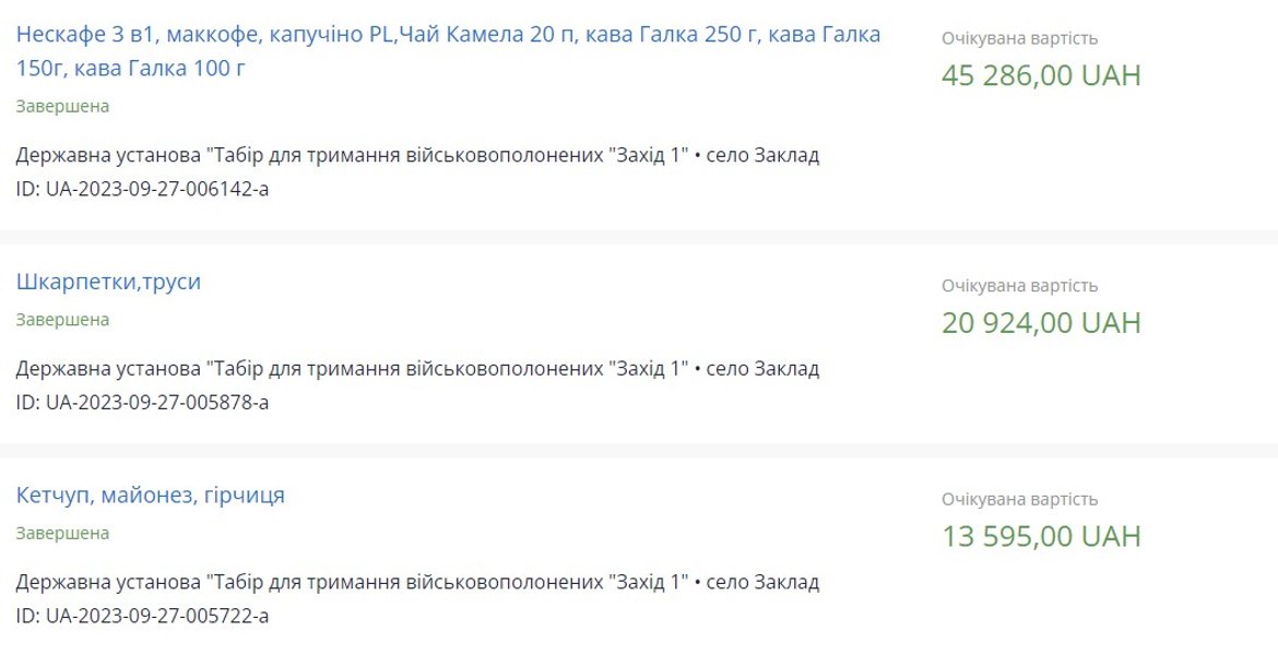 Державна установа "Табір для утримання військовополонених "Захід 1", в якій перебувають російські полонені, провела низку тендерів у електронній системі державних закупівель Prozorro. Колонія придбала сало, загущене молоко, цукерки, м'ясопродукти, супи-пюре і навіть засоби гігієни у одного продавця. Ціни на товари виявились на кілька відсотків вищі за ціни, вказані на торгівельних майданчиках в мережах. У деталях закупівель розбирався Фокус.