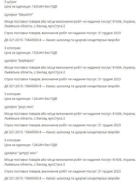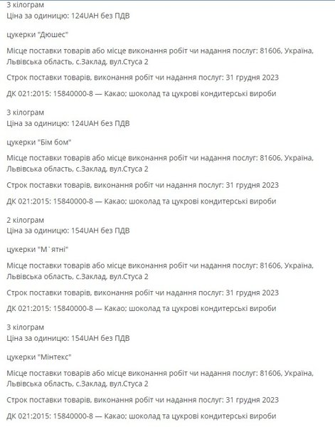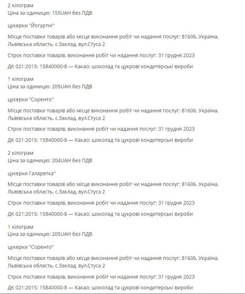Цукерки: планують витратити 12434 грн на 17 видів солодощів. Найдорожча позиція — цукерки "Соренто" за 205 грн/кг. У мережі аналогічний коштує 200 грн.