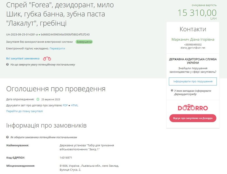 За час моніторингу державних закупівель ФОП успішно взяв участь у 104 тендерах для колонії, постачав все що завгодно — від ковбаси до парфумів — на загальну суму 855 млн грн.