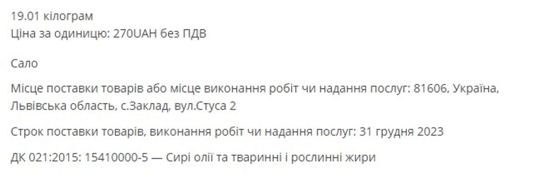 Інформація з системи державних закупівель показує, що сало для російських полонених можна було б знайти і дешевше. Крім того, побіжний пошук у системі показує усі витрати колонії — від тендерів на електроенергію до тендерів на зошити. Також можна побачити, що полоненим купують каву та кавові напої за 45 тис. грн та олію за 75 тис. грн.