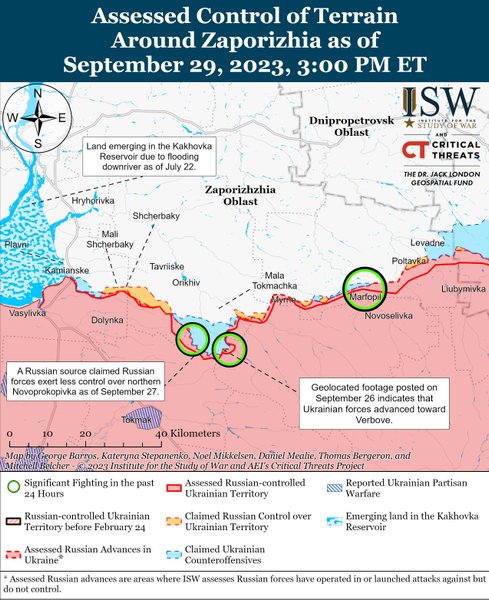Аналітики ISW також розповіли про ситуацію на лінії фронту в Україні. Зокрема вказали, що ЗСУ атакували позиції ЗС РФ у трьох точках на Запорізькому відтинку фронту: на північ від Роботиного, на південь від Роботиного біля Новопрокопівки та на захід від Вербового. Підтвердили, що Сили оборони намагаються тиснути на росіян на лінії Кліщіївка-Андріївка-Курдюмівка.