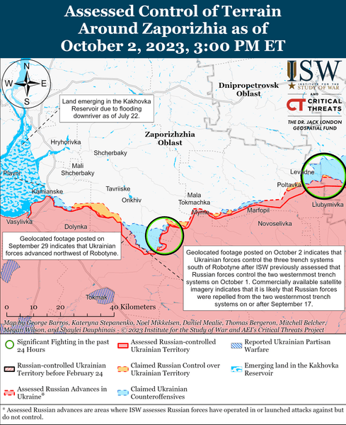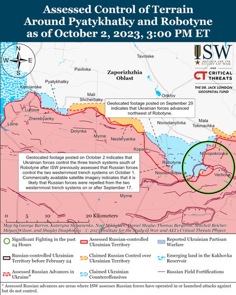Українські війська у вересні відсунули підрозділи ЗС РФ на кількох ділянках на Запорізькому відтинку фронту та під Бахмутом. Зокрема, на карті бойових дій видно прорив біля Роботиного та Вербового та звільнені населені пункти на південь від Великої Новосілки. Тим часом як на сході вдалось звільнити Кліщіївку та Андріївку за 3-8 км від Бахмуту. Російські командири, які воювали на цих ділянках, скаржаться на накази генералів ЗС РФ. Генерали начебто примушували їх іти в контратаку без належної підготовки. Про деталі ситуації в армії Росії ідеться у аналітичному звіті Інституту вивчення війни (ISW) від 2 жовтня 2023 року. Звіт викладений на порталі інституту.