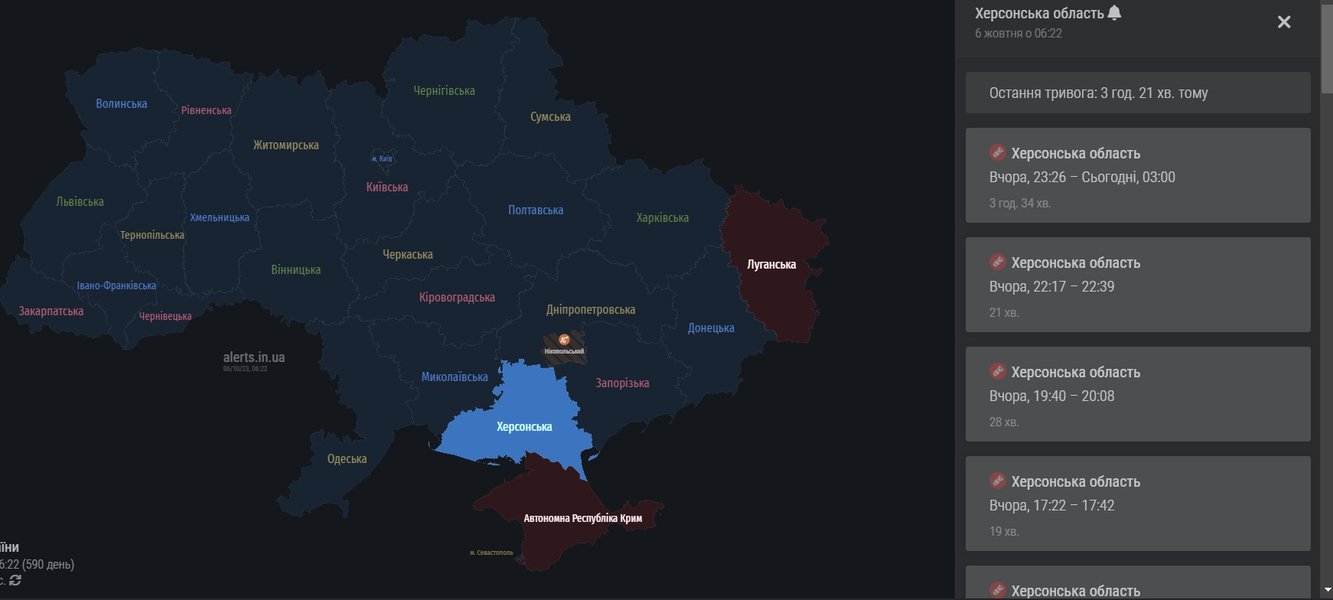 Перший сигнал повітряної тривоги, пов'язаної з нічним обстрілом РФ, пролунав на Херсонщині о 23:26. Повітряне командування повідомило про загрозу удару дронів-камікадзе Shahed, які стартували з полігону Чауда в Криму. Тоді ж Повітряне командування попередило про ударні безпілотники, які зайшли через Харківську область.