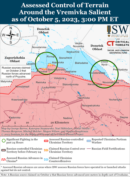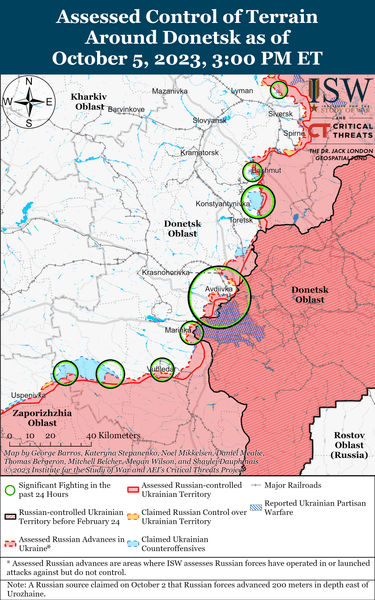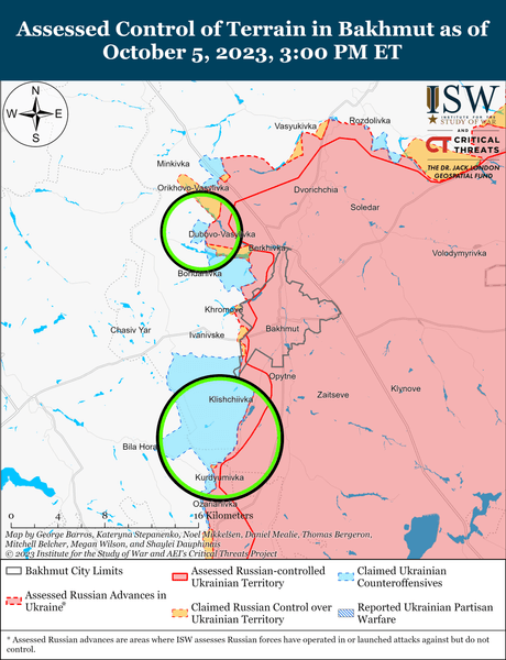 Російські війська вели наступальні дії поблизу Бахмута, намагаючись відбити втрачені позиції, але не просунулися 5 жовтня. Російські сили все ще утримують нещодавно захоплені позиції поблизу Оріхово-Василівки на північний захід від Бахмута.