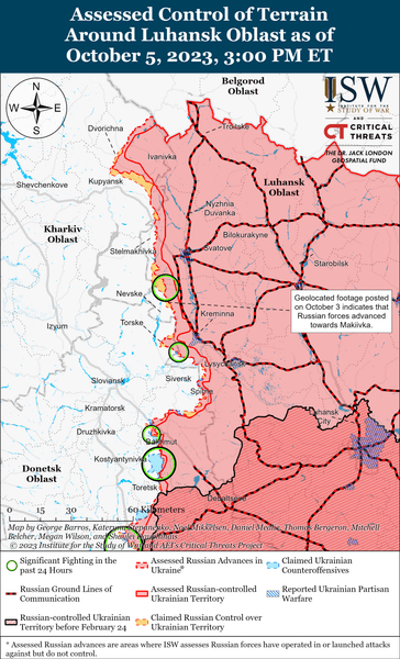 5 жовтня російські війська збільшили інтенсивність бойових дій на лінії Куп’янськ-Сватове-Кремінна, але підтверджених територіальних здобутків не досягли. В ЗСУ повідомили, що ЗС РФ активізували бойові дії на Куп’янсько-Лиманському напрямку та зосереджують зусилля на наступальних операціях у Макіївці на Луганщині. Російський військовий блогер стверджував, що ЗС РФ захопили нові позиції поблизу Макіївки, але ISW не знайшло підтвердження цієї заяви.