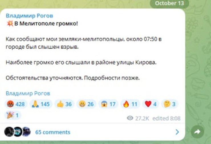 Станом на 14:40 дня 13 жовтня жодних подробиць щодо вибухів в Мелітополі він не повідомив.