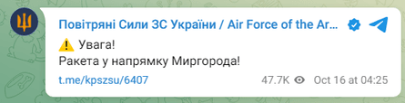 Зокрема, як повідомили в Повітряних силах, агресор запустив ракету в бік міста Миргород Полтавської області. Чи була ракета перехоплена — не повідомлялося, проте пізніше з'явилося повідомлення про роботу ППО.