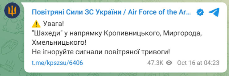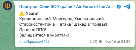 Слід зазначити, що тієї ж ночі, 16 жовтня, російські збройні сили здійснили комбіновану атаку, використовуючи ударні безпілотники та ракети, по низці регіонів України.