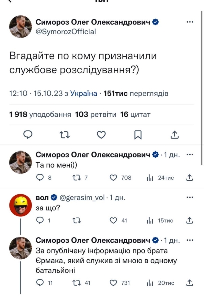 "Вгадайте, по кому призначено розслідування? По мені. За опубліковану інформацію про брата Єрмака, який служив зі мною в одному батальйоні", — написав він у своєму твітері.