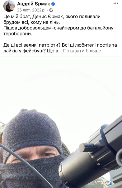 Натомість Андрій Єрмак ще 25 лютого розмістив пост в своїму пабліку і повідомив, що його брат служить в бригаді ТРО снайпером.