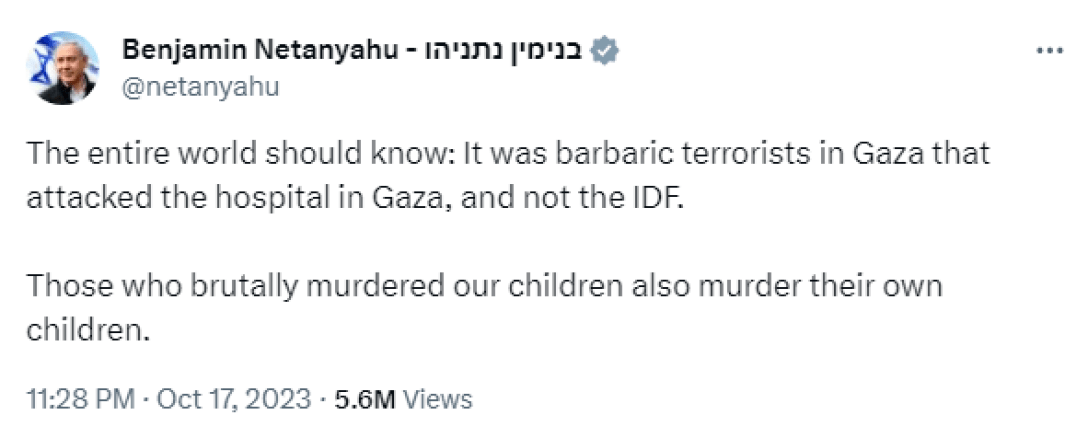 "Весь світ має знати: Це варварські терористи в Газі напали на лікарню в Газі, а не ЦАХАЛ. Ті, хто по-звірячому вбиває наших дітей, вбивають і своїх власних дітей", — написав прем'єр.