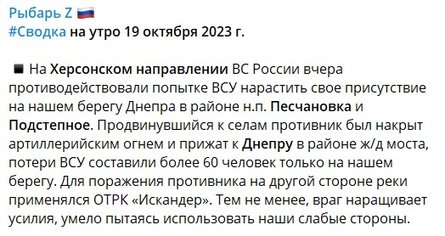 Тим часом у дописі 18 жовтня один з військкорів РФ зазначив, що перед атакою на Херсонщині ССО ЗСУ захопили у полон російського офіцера. Командування планує кидати на плацдарм, як у "м'ясорубку", підрозділи "Шторм" ЗС РФ. Інший військкор 19 жовтня вказав, що росіяни намагаються зупинити просування Сил оборони за допомогою ракет "Іскандер".