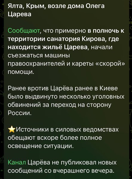 "Нічна НП біля будинку Олега Царьова. Минулої ночі сталася надзвичайна подія біля будинку ексдепутата Верховної ради Олега Царьова, який проживає в Ялті. Очевидці розповідають, що приблизно опівночі до території санаторію Кірова, де розташоване житло Царьова, почали з'їжджатися машини правоохоронців та карети "швидкої" допомоги", — йдеться в повідомленні.