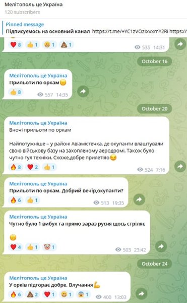 "Підписникам "РІА-Мелітополь" і Telegram-чату "Мелітополь — це Україна" надіслано попередження про кримінальну відповідальність за передачу відомостей українській стороні на шкоду безпеці Росії та повідомлення про незаконну діяльність зазначених засобів комунікації. Функціонування інформаційних ресурсів припинено", — йдеться в повідомленні.