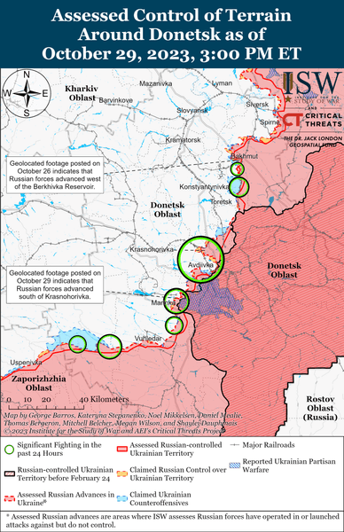 Геолоковані кадри, що публікувалися 29 жовтня, свідчать про те, що ЗСУ просунулися через залізничну лінію на південь від Андріївки (10 км на північний захід від Бахмута).